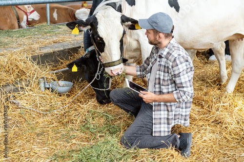 Male agricultural worker inspecting dairy cows with tablet in barn