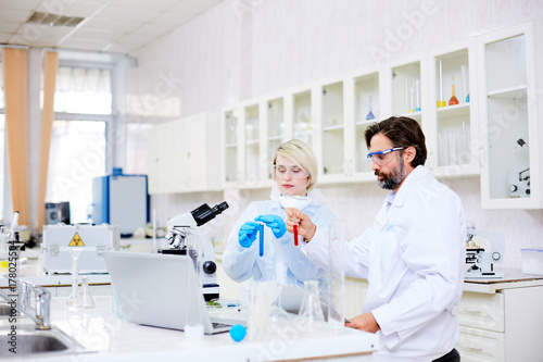 Male and female chemists analyzing new liquids or vaccine in flasks