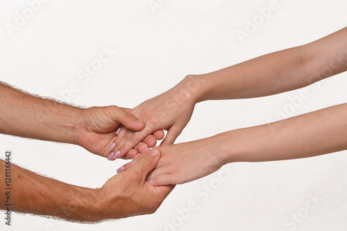 male and female hands gently hold each other. on a white background. close-up