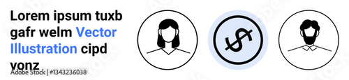 Male and female profile icons flank a central dollar currency symbol. Ideal for financial services, user interfaces, team profiles, gender balance, earnings, economy, or a simple landing page