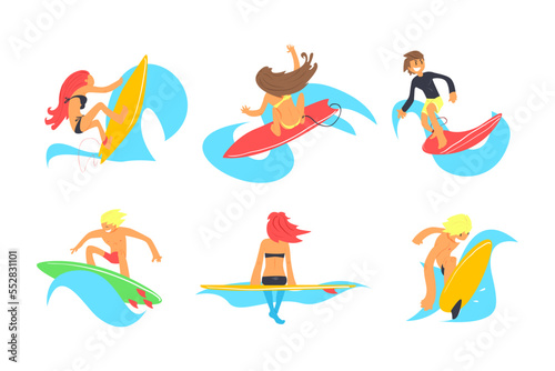 Male and Female Surfer Riding Moving Wave of Water Standing on Surfboard Vector Set