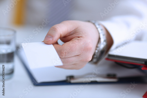 Male arm in suit give blank calling card to visitor closeup. White collar colleagues company name exchange job interview sale clerk id executive or ceo finance support formal identity concept