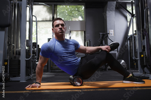Male athlete relaxing muscles after working out, using foam roller at gym