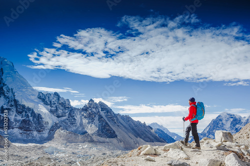 Male backpacker enjoying the view on mountain walk in Himalayas. Travel, adventure, sport concept