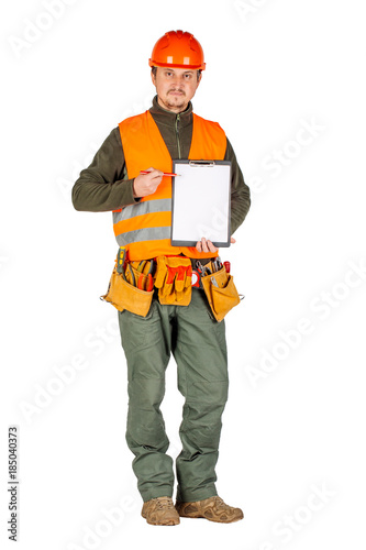 male builder or manual worker in helmet holding a clipboard and shows with a pencil on the clipboard over white wall background.