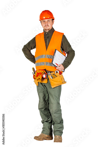 male builder or manual worker in helmet holding in left arm a clipboard right hand on hip and pencil over white wall background.
