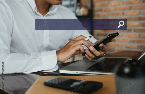 Male businessman clicking internet search page on computer and smart phone touch screen in the office.