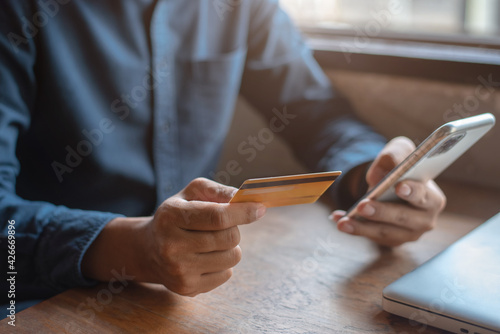 Male businessman use credit cards to conduct financial transactions through phones and laptop.