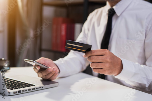 Male businessman use credit cards to conduct financial transactions through phones, tablet, and laptop.