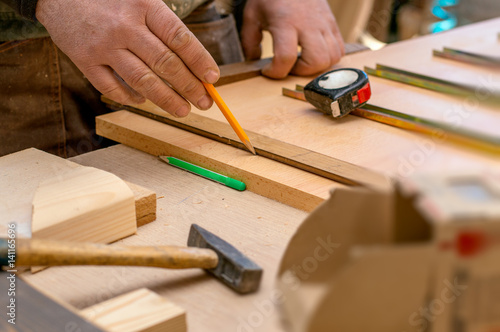 Male carpenter hands drawing mark on wooden flooring with ruler and pencil