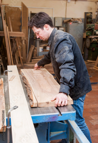Male carpenter sawing a board on a stationary circular saw in a carpentry workshop
