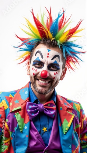 Male clown with spiky rainbow hair on white background. For circus performances.