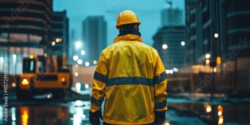Male construction worker in a yellow safety jacket and helmet at dusk on a construction site.