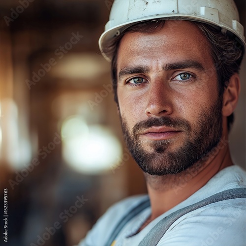 Male Construction Worker with Hard Hat and Safety Gear. Portrait of a Professional Builder at an Active Job Site