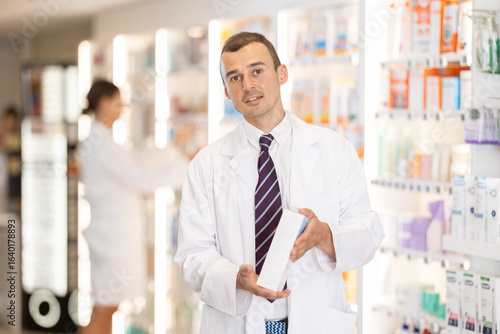 Male consultant pharmacist holds box in hands and offers to purchase remedy to alleviate condition. Specialist recommendations according to clients problem, help at pharmacy.
