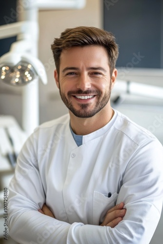 Male dentist smiling confidently in a modern dental office