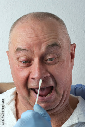 male doctor in gloves takes with swab sample from nose for analysis, rapid nasal test covid-19, detection of viral disease, police investigation, determine paternity, medical examination, coronavirus