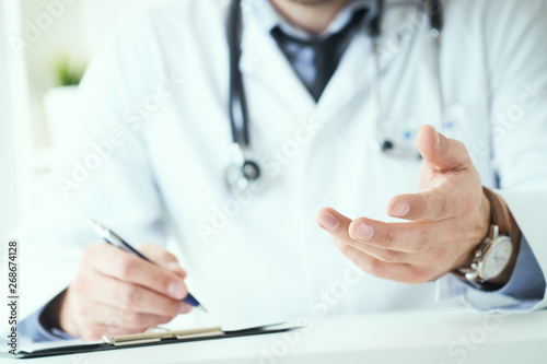 Male doctor making welcome gesture, politely inviting patient to sit down in medical office. Photo with depth of field.
