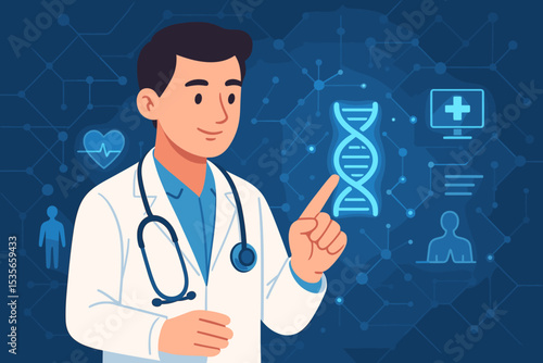 Male doctor with stethoscope analyzing DNA data on a virtual interface. Healthcare technology, genetics, and medical diagnosis concept. Biotechnology and futuristic medicine vector.