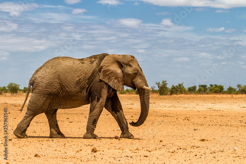 Male elephant walking in the dry western part of Etosha National Park in Namibia