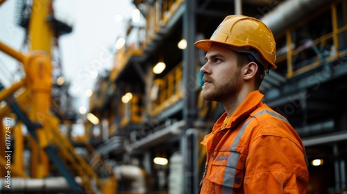 Male engineer wearing safety uniform standing in front of oil refinery. Petrochemical Gas Industry.