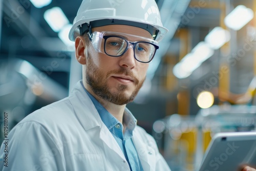 Male engineer with beard wearing a hard hat, safety glasses, and lab coat, standing in an industrial facility and holding a tablet.