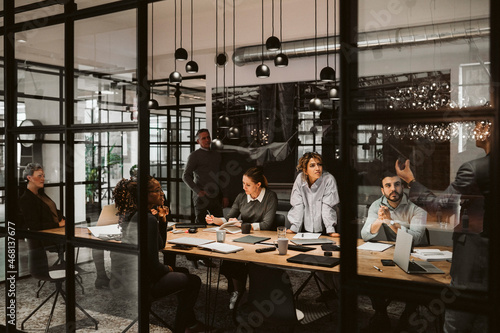 Male entrepreneur discussing with team during meeting at creative office