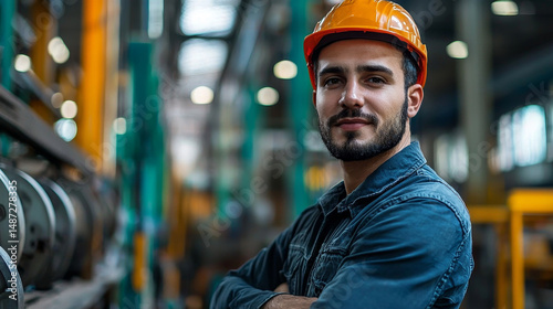 Male factory worker posing and looking directly at the camera