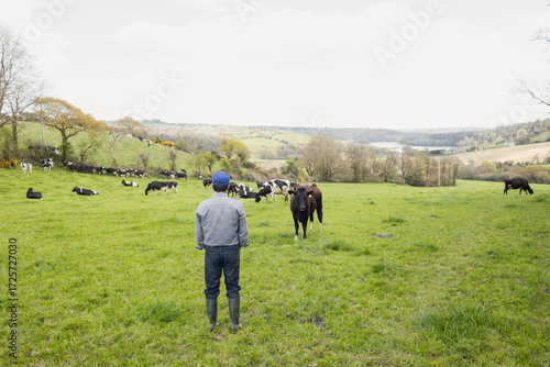 Male farmer wearing baseball cap and rubber boots standing in green pasture facing herd of cattle