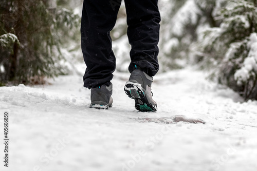 Male feet are walking along a snowy path in the forest. Close-up. Active lifestyle. Walk in the woods. Winter in the forest. Winter road.