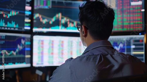 Male financial analyst working on multi monitor