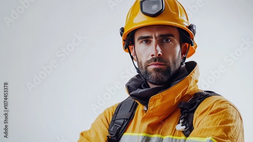 Male firefighter standing with arms crossed on a white background, wearing firefighter uniform and helmet, determined and professional expression