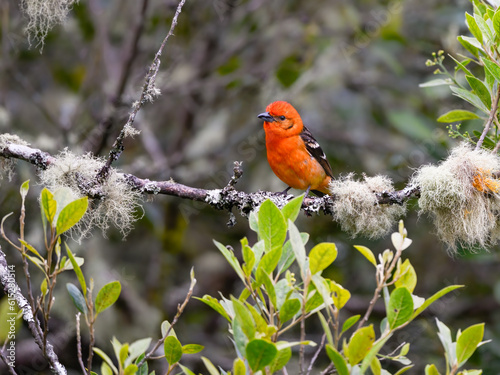 Male Flame-colored Tanager on mossy dead tree branch against green background