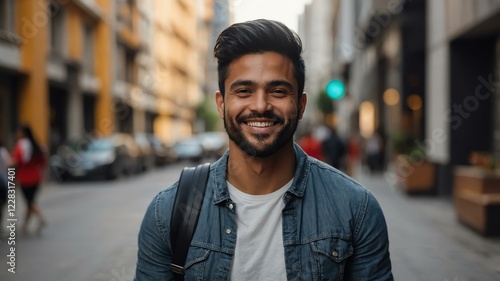 male graphic designer on busy urban street background