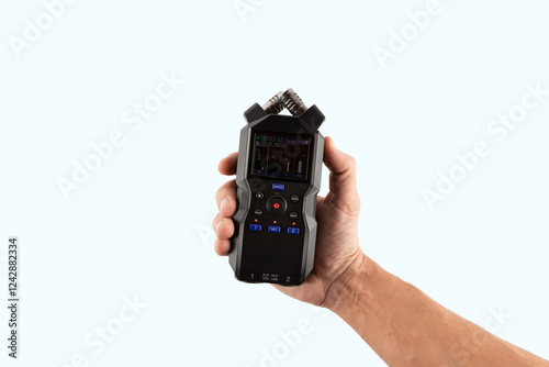 Male hand holding an audio recorder isolated on light cyan background
