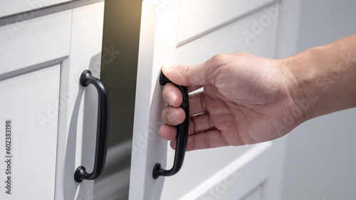 Male hand holding black door handle opening white wooden cabinet. Home furniture detail.