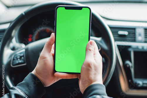 male hand holding mobile phone with chroma key blank green screen mockup inside car. car dashboard in the background. Navigation, mobile applications and automotive technology concept.