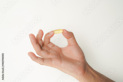 Male hand holding soft gels, Fish oil capsules, omega 3, omega 9, vitamin D, vitamin E, supplements