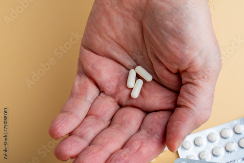 Male hand holding three capsules with medicine, vitamins or sports supplement in hand on yellow background. Close up of Vitamin D pills in blister packs on yellow background.