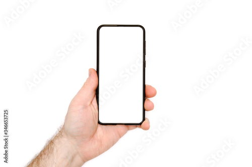 male hand holds a modern black smartphone on a white background. white display. blank for different ideas.