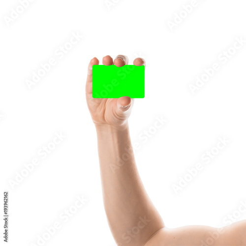 Male hand holds a two credit card or business card. Isolated with chroma key and all isolated on white background.