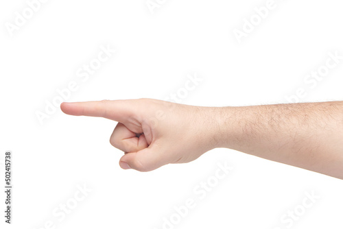 Male hand index finger isolated on white background. Brutal man finger pointing on object or direction. Finger gestures.