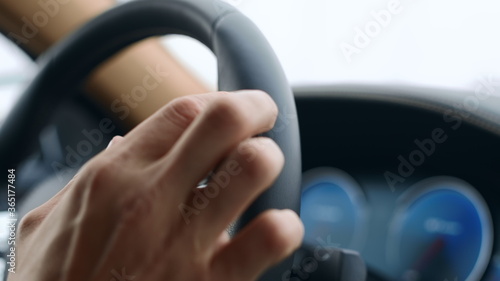 Male hand knocking fingers on steering wheel. Man putting fingers on wheel