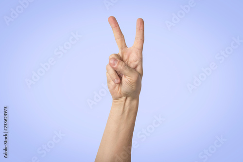 Male hand raised up and showing a gesture of peace with two lifted fingers on a blue background. Gesture Yo. Concept of power, unity, rap respect