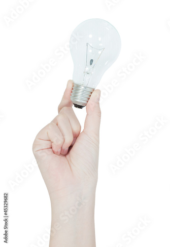 male hand show the light blub on white background