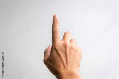 Male hand with index finger pointing up. White background.