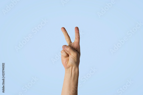 Male hand with two fingers raised against a blue background. Side picture. Peace gesture, greeting