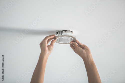 Male hands installing socket for light bulb