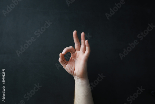 Male hands on a gray background. Finger gestures. Gesticulation with hands.