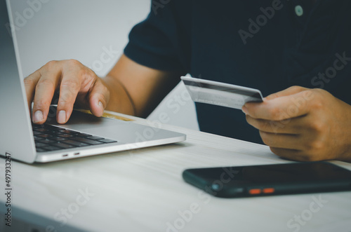 male hands on computer keyboard doing financial and credit card transactions or online shopping on the Internet.